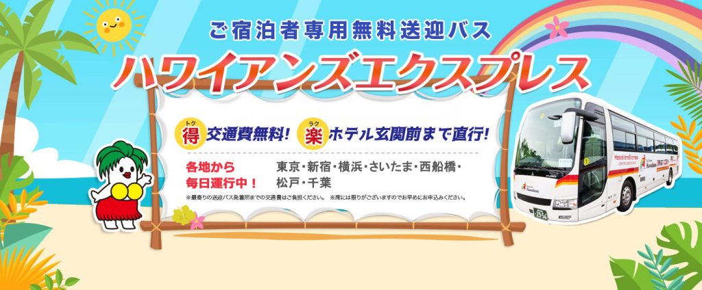 交通費 無料✨ ホテル直行送迎バス 東京駅 ⇔ ハワイアンズ